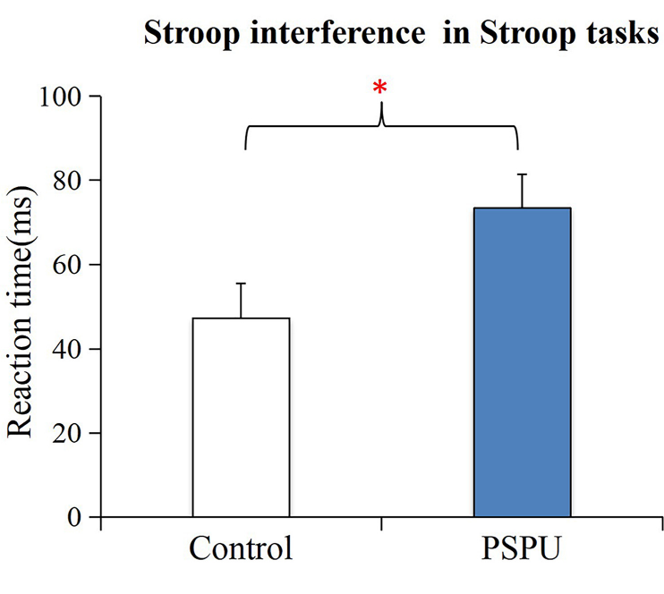 任务与组间交互效应显著(F=10.751,p=0.001),简单效应分析显示,PSPU组的Stroop干扰效应(103.285±65.066ms)显著高于对照组(63.954±60.567ms)(t=3.283,p=0.001),提示PSPU人群抑制控制功能显著下降。