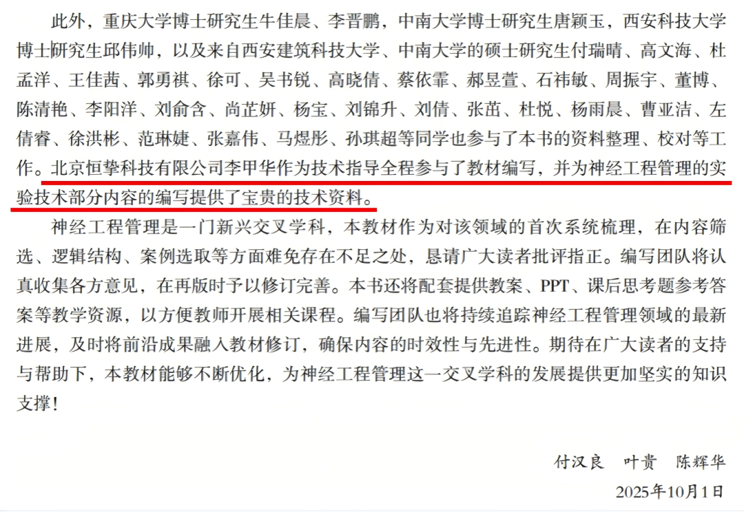 📌 导语:近日,由北京恒挚科技有限公司(以下简称“恒挚科技”)深度参与并提供核心支持的教育部产学合作协同育人项目(项目名称:“人因与神经科学”实践条件和实践基地建设,项目编号:2507083626)取得标志性成果——我国“脑机接口+工程管理”领域首部教材《神经工程管理导论》由中国建筑工业出版社正式出版发行。