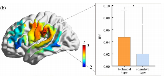②IBS水平:两类知识转移均存在显著IBS,技术型组IBS水平显著高于认知型组,不同知识类型对应脑区的IBS分布不同,H2得到支持;