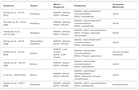 常见的独立fNIRS分析的主要局限性是在现实环境中,神经元对重复试验或刺激的反应在整个实验中是时变的,这与构建GLM分析设计矩阵中常用的boxcar函数不一致。而基于EEG的fNIRS分析的核心思想是用来自EEG信号的感兴趣的时间或频率替换或调整fNIRS GLM分析中的 Boxcar 函数。基于神经血管耦合的线性假设,脑电图中提取的神经活动特征可以更好地估计HRF卷积后fNIRS的响应,从而提高识别实验任务诱导的相关活动区域的效率。图G总结了基于EEG的fNIRS分析的广义分析框架。表1总结了有关于进行基于EEG的fNIRS分析的研究。