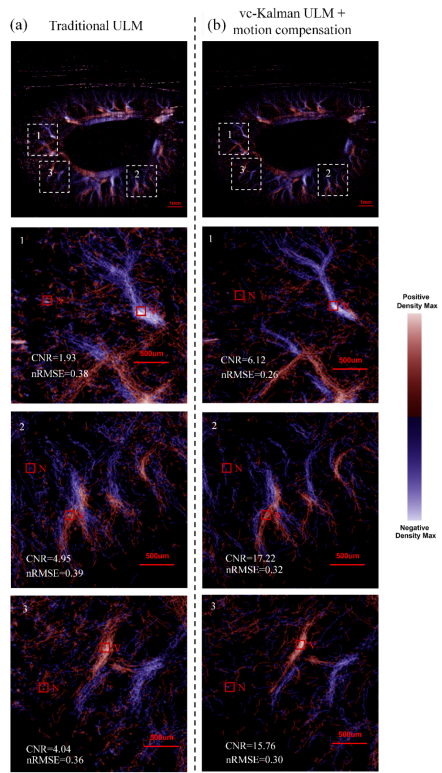 (2)自适应运动补偿机制:结合动态规划与互相关搜索,有效消除呼吸、心跳等组织生理运动带来的图像扰动,确保在心、肾等生理运动幅度较大的器官中也能重建出高精度的超分辨率血流通路图像。大鼠肾皮质中微血流成像(图2)实验结果显示,基于动态规划的互相关搜索过程可实现有效的运动补偿,成功抑制了大鼠肾脏因呼吸、心跳及轻微组织运动而产生的噪声和扰动,清晰显示微小血管的边缘轮廓,图像信噪比(CNR)和误差指标(nRMSE)全面优于传统算法。