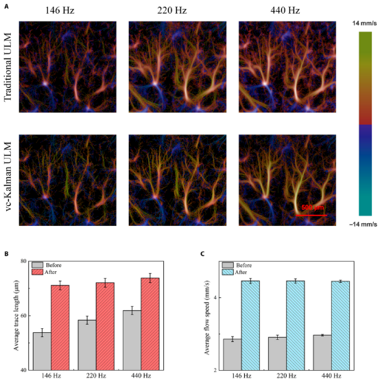 (3)低帧率条件下保持“稳、准、清”:本研究提出的vc-Kalman算法成功解决了传统ULM在低帧率成像时的轨迹匹配精度下降问题。通过融合微泡亮度特征与历史位置等多维信息,即使在146 Hz的帧率条件下也能实现可靠的微泡定位和微血流成像,这一突破将显著降低数据采集和传输要求,为便携式设备和术中实时成像铺平道路。图3展示了不同采样帧率下传统ULM方法与vc-Kalman ULM方法成像的结果对比,很明显vc-Kalman算法相较于传统算法具有更高的鲁棒性。