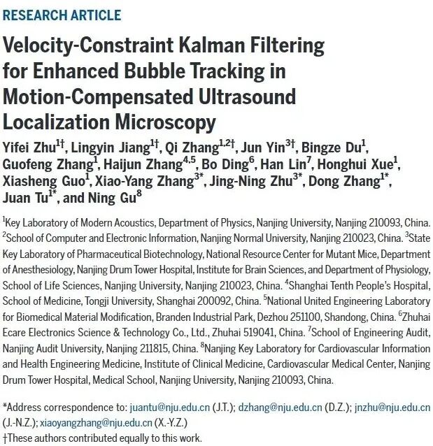 南京大学屠娟教授、朱景宁教授与顾宁院士课题组联合提出基于速度约束与运动补偿的超快超声定位显微成像算法,并在大鼠脑、肾等器官中实现了微血管网络的超分辨率成像,绘制高清晰“生命微观通路图”,为心脑血管及微循环系统相关的基础医学研究和重大疾病诊疗提供了全新显像工具。这一题为“Velocity-Constraint Kalman Filtering for Enhanced Bubble Tracking in Motion Compensated Ultrasound Localization Microscopy”的工作近日发表于Research期刊上(2025,8:0725,DOI:10.34133/research.0725)。